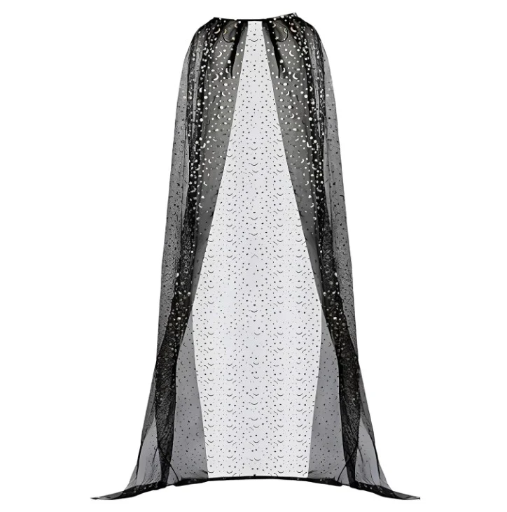 You can stand out from the other divas of the night in this long black sheer hooded open front cape with gold foil celestial designs. Perfect for Halloween, witches, gothic looks, Harry Potter witches and wizards, vampires, cosplay, theatrical productions, spiders and more. Dress and footwear not included. Other vampire, witch and creature of the night costumes and accessories sold separately on our page – subject to availability. One size fits most adults (unisex) and may even fit larger teens.