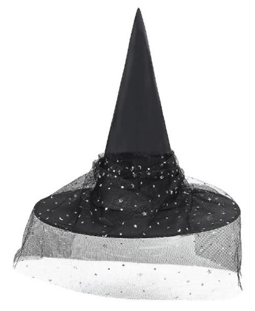 Take your Halloween witch style to the next level with this black witch hat (7.5" x 15") wrapped in a moon and star mesh and finished with a pretty silver faux jewel plastic slide buckle. It will be a hit at Halloween whether for Trick or Treating or for a party. Also great for cosplay, theme parties, the Sanderson Sisters, theatrical productions, Harry Potter and more. One size fits most teens and larger children. Other witch costumes and accessories (broom, jewelry, theatrical makeup) are sold separately on our page – subject to availability.